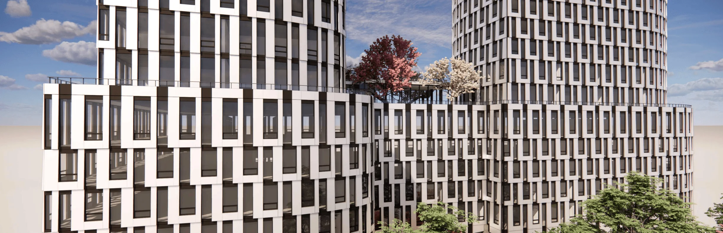 Elysium's High Park North development features designs from Teeple Architects, which show the two towers atop a shared six-storey podium element with a walkway separation bisecting the first two storeys. For the site layout, 41-storey 'Tower A' would be on the western portion of the site, while 39-storey 'Tower B' would be on the east.